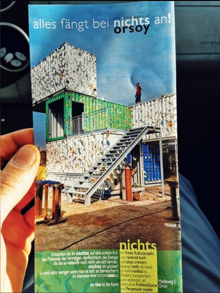 Der Orsoyer Containerturm Nichts ist das geistige Kind von Reinhold Kuch und Aloys Cremers. Als niederrheinisches Perpetuum mobile ist die alternative Freiheitsstatuet ein Eckstein in Aloys’ Niederrheinzyklus, einer von vielen. Das Nichts wirkt bereits, auch wenn es offiziell noch eine Baustelle ist – doch schon jetzt gibt es hier Nichts zu sehen. Gestern saßen wir zu Dritt beieinander, bei einem Kaffee in Reinholds Garage, und haben über den status turris geredet. Wir sind uns sicher, dass Reinhold als Turrist schon bald Touristen in Orsoy empfangen wird, die das Nichts ausfüllen und mit ihrer Eigenenergie beleben, aufeinandertreffen und ihre Wesenskerne zum Strahlen bringen, als wären sie auf der Suche nach dem Higgs-Bosom – ganz im Sinne der Aloys’schen Befreiungsphilosophie.