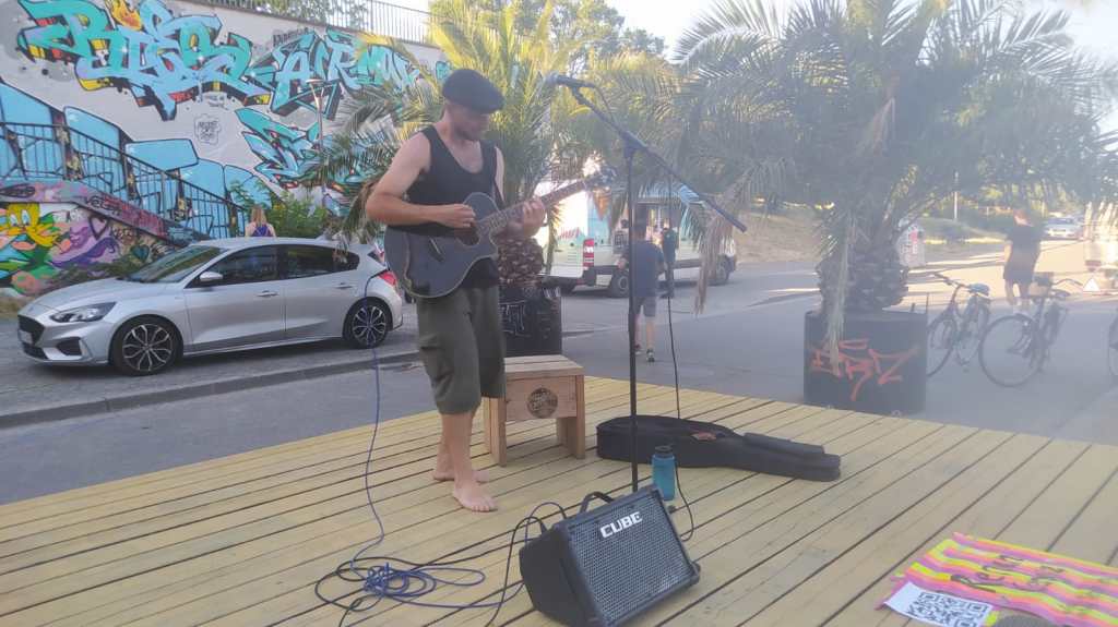 Oficially, busking is highly regulated in Heidelberg. A stroll through the city tells another story: Especially at the weekends the historic city center is full of musicians, and most of them know their job quite well. On our last day, we even hit a real stage – the city has set up some of them on the brinks of the Neckar for entertainment, each one comes with a bar. The one next to our camper van becomes a stage for Renan after the official program is over. That’s not especially allowed, but everyone, including the staff, seems to be happy about more music.