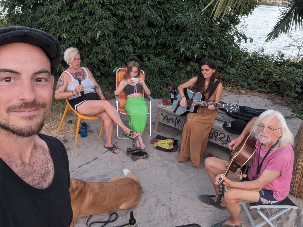 Am späten Nachmittag kapern wir die Bühne der NeckartOrte; das offizielle Programm ist vorüber, die Bar noch geöffnet und die Leute haben Lust auf Musik, also spielt Renan ein Set auf Hut am Neckarstrand in der Nachmittagssonne. Kurz danach kommt Biene zu Bühne, ebenfalls eine Bekannte von Michael und Singer/Songwriterin. „Hast du Bock auf ne Jamsession?“ Die Antwort manifestiert sich eine halbe Stunde später neben Tims Crêpefahrrad, bis weit nach Einbruch der Dunkelheit musizieren wir am Neckar, ein Abschiedskonzert für Heidelberg – morgen geht’s weiter, und wohin genau, weiß nur der Wind.