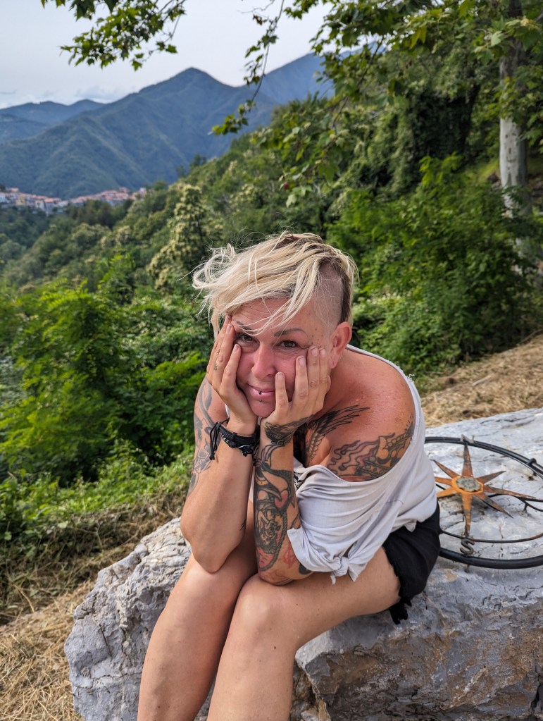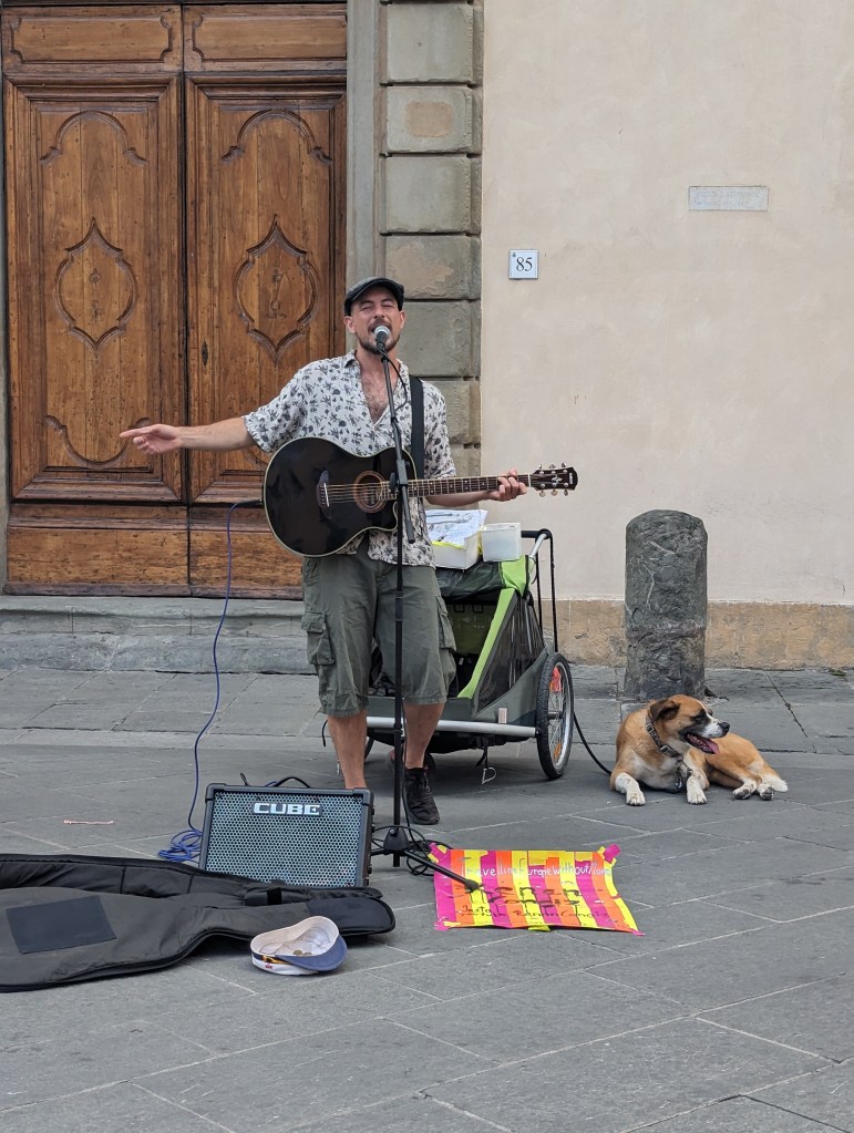 Um Maut und Sprit und die Platzmiete und die Pizza zu kompensieren, steht – nach den besonderen Konzerten in der Garfagnana – mal wieder klassische Straßenmusik auf dem Programm. Mit reduzierten Erwartungen (Pisa war eine Lektion in Genügsamkeit) suchen wir uns zunächst einen Platz an einer Straßenecke im Zentrum. Tatsächlich liegt die finanzielle Ausbeute eher im Pisa’schen Mittelfeld, aber die Menschen machen das wieder wett: Eine Frau bleibt stehen und hört sichtlich gerührt unter Tränen zu, erzählt in einer Pause, dass ihr Mann ebenfalls Gitarrist und Sänger war und vor wenigen Tagen gestorben ist – sie erkennt ihn in Renan wieder und es entsteht ein sehr besonderer Moment der Vertrautheit und des Trostes unter völlig Fremden. Ein Rosenverkäufer, selbst mindestens so mittellos wie wir derzeit, schenkt Manu eine Rose und setzt sich zu ihr. Die Besitzer*innen der Lädchen und Restaurants hören zu und nehmen Anteil, und eine weitere Frau ist zu Tränen gerührt und muss von ihren Angehörigen behutsam weitergezogen werden – aus Gründen, die wir nie erfahren werden. „Das war eins der besten Sets, die du je gespielt hast“, sagt Manu. Und Renan ist, wie immer bei diesem Bullenwetter, nassgeschwitzt bis auf die Unterhose. „Ich geh mich eben umziehen und frischmachen, dann spielen wir noch ne Runde.“ Gesagt, getan, und während Renan zum Stellplatz schlurft, lernt Manu einen Straßengaukler kennen, der uns einlädt, am nächsten Tag zu ihm und seinen Kolleg*innen – allesamt fahrendes Künstlerpack – zu stoßen und Teil der Truppe zu werden. Was für Aussichten!