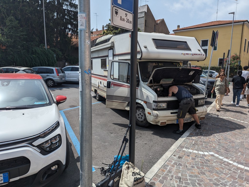 Der Gitarrenladen befindet sich in Albenga. Auf dem Weg dorthin beginnt Berta zu schwächeln: Die Batterieleuchte leuchtet, die Tank- und Temperaturanzeige spinnt. Während Renan im Laden ist, parkt Manu auf einem kleinen Parkplatz in der Nähe, und als alle wieder in der Berta sitzen, will das alte Mädchen nicht mehr zünden. Manu kontaktiert den ADAC, nach viel Warterei und einem missglückten Reparaturversuch vor Ort ist klar: Wir müssen uns ein Zimmer nehmen, Berta wird am nächsten Tag abgeschleppt werden. Dank der ADAC-Plus-Versicherung bedeutet das aber nicht das Aus unseres Experimemts: Die Übernachtungs- und Mechanikerkosten trägt der ADAC, wir werden voraussichtlich nur die Materialkosten begleichen müssen. Wie viel das ist, ist schwer zu sagen. Wir nehmen das Ganze gelassen und freuen uns auf drei Nächte BnB in Albenga. Sollte Berta dann nicht fit sein, müssen wir wohl oder übel aufs Zelt oder Couchsurfing umsteigen, denn Unterkünfte in unserem Budgetrahmen gibt es weit und breit keine.