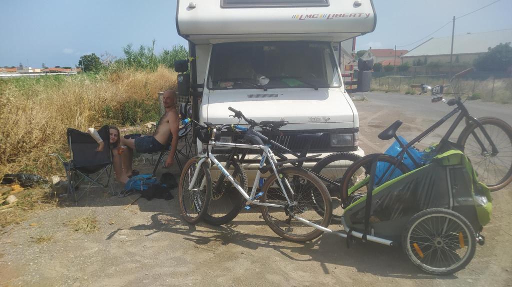 Am Samstag packen wir unsere sieben Sachen und hecken einen Plan aus, Berta abzuholen, die vier Städte weiter repariert nahe der Werkstatt steht. Der Plan geht so: Manu fährt mit Maja mit dem Zug und läuft vom Bahnhof zur Werkstatt, Hermine und Renan fahren die gut 20 Kilometer mit dem Rad, wobei Hermine Manus E-Bike reitet und Renan mit seinem Treck-MTB den Anhänger mit unseren sieben Sachen und Hermines Fahrrad zieht. Im Grunde ein guter Plan, doch während der Fahrt stellen Hermine und Renan fest, dass es die meiste Zeit bergauf geht, ein permanenter Gegenwind weht und die Alternativroute zur Hauptstraße, die die Radwander-App vorschlägt, über sehr sportliche, sehr enge und teilweise unbefahrbare Hochgebirgssträßchen führt, die für Renan nicht zu schaffen sind. Drei Stunden, einige Liter Schweiß und drei Dutzend gerissene Nerven später sind wir dann trotzdem alle wieder vereint: Manu und Maja warten schon bei Berta, Hermine und Renan rollen ein, und der Trip kann weitergehen.