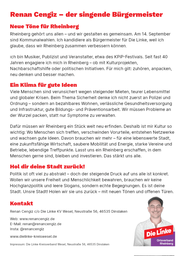 „Uns ist es wichtig von den Problemen zu erfahren, die die Bürger*innen Rheinbergs direkt benennen – damit wir diese angehen und im besten Fall beheben können. Daher möchten wir wissen, was die individuellen Sorgen und Anliegen sind und haben dafür unseren Meckerzettel entworfen, der in Null-Komma-Nix ausgefüllt ist“, so Renan Cengiz.
