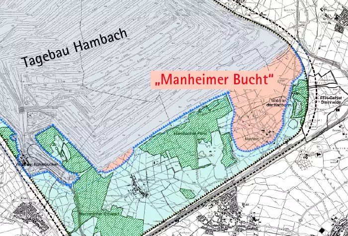 RWE will im Sündenwäldchen Sand und Kies für die Böschungen des geplanten Hambacher Sees gewinnen. Keine Braunkohle. Ab 2030 soll das Tagebauloch mit Wasser geflutet werden – als „Erholungsgebiet“ mit Yachthafen und künstlichen Inseln. Ein Freizeitpark auf den Trümmern eines Ökosystems; Luxus auf den Ruinen der Natur. Landraub, Naturzerstörung und Grundwasservergiftung für Konzerninteressen.
