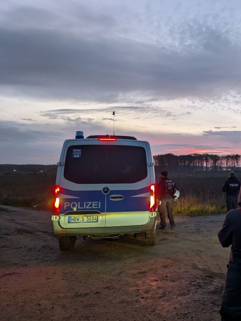 Der Sicherheitsdienst trifft als erster ein, positioniert sich rund um das Waldstück und die Mahnwache an der Esperantostraße. Dann fährt die Polizeikolonne mit 40 bis 50 Einsatzwagen auf. Dabei sind die Polizei Rhein-Erft-Kreis, Bereitschaftspolizei-Hundertschaften und Höhenspezialisten, die eigens aus Bayern angereist sind. Der Bundestagsabgeordnete Fabian Fahl und die RVR-Abgeordnete Manu Cengiz Bechert von der Linken sind als parlamentarische Beobachtung schon früh vor Ort – eine der wenigen unabhängigen Perspektiven an diesem Tag. Auch Abgeordnete der Grünen aus dem NRW-Landtag treffen später ein, darunter Antje Grothus; sie bleiben allerdings nicht lange.