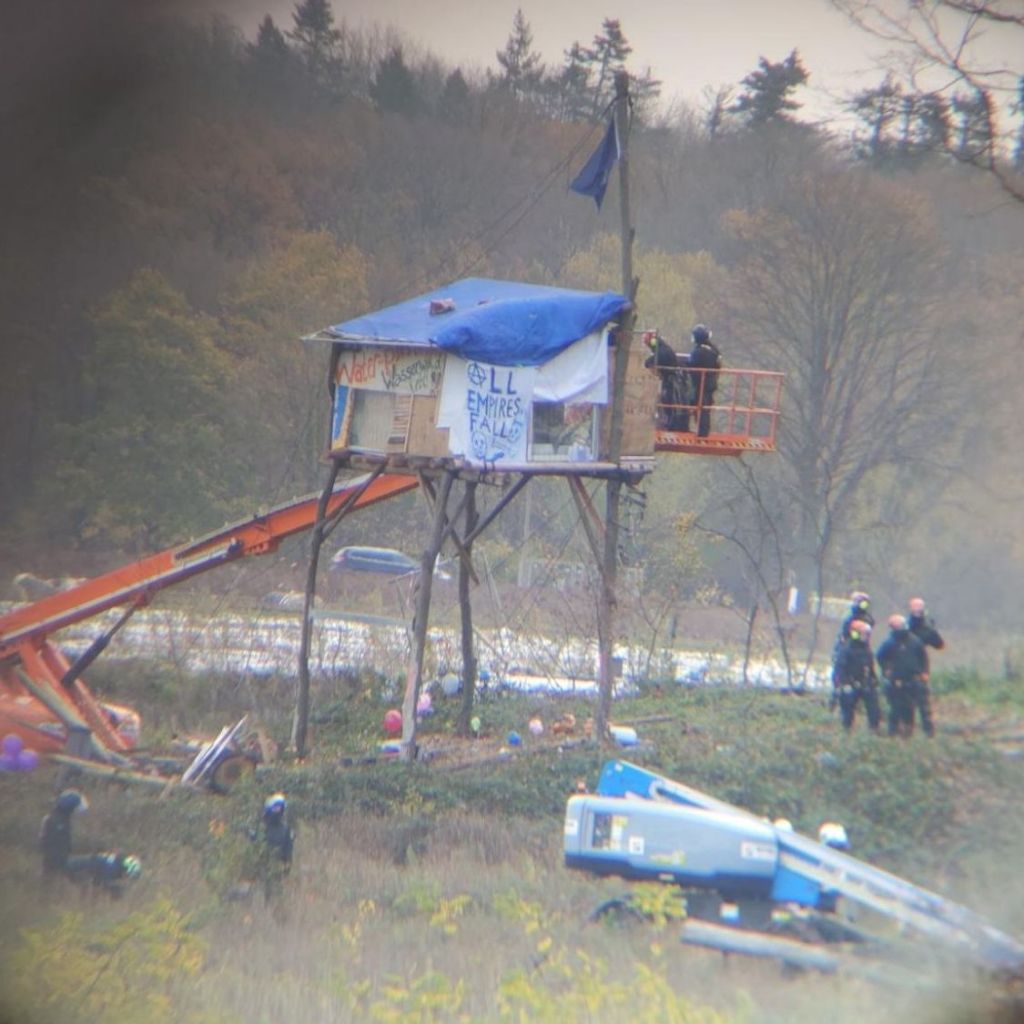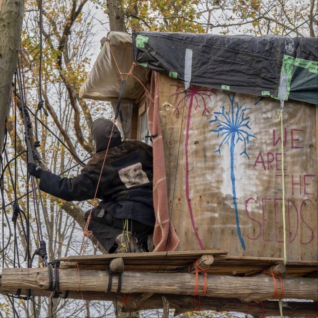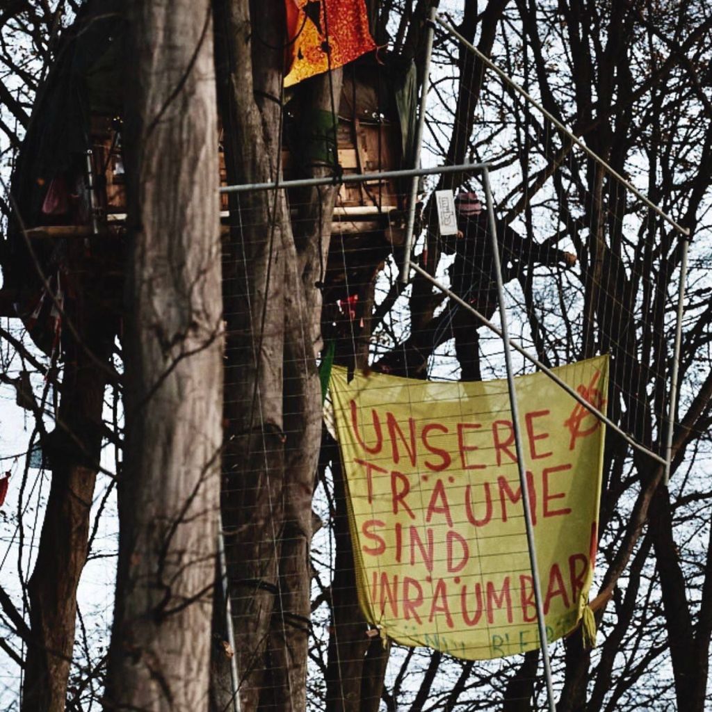 16 Personen, etwa 20 Strukturen, so lautet die Einschätzung der Polizei. Bis zum frühen Nachmittag sind nur noch drei Baumhäuser besetzt, ein weiteres steht leer. Der Rest ist zerstört. Dutzende Bäume werden gerodet. Dann fällt „Glühwürmchen“ – „Rest in Power“, kommentiert die Besetzung den Verlust des Baumhauses im Ticker.